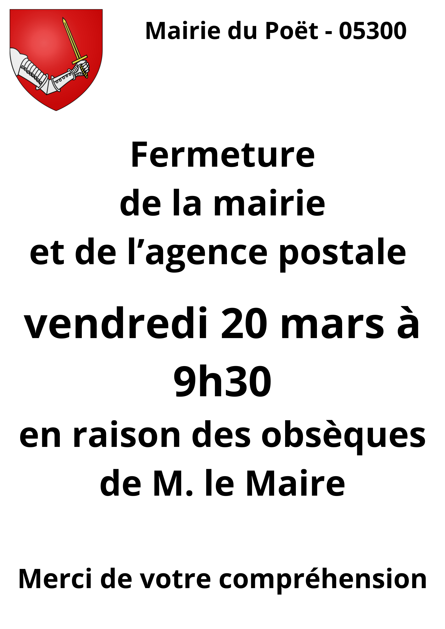 Fermeture exceptionnelle de la mairie et agence postale vend 20 mars