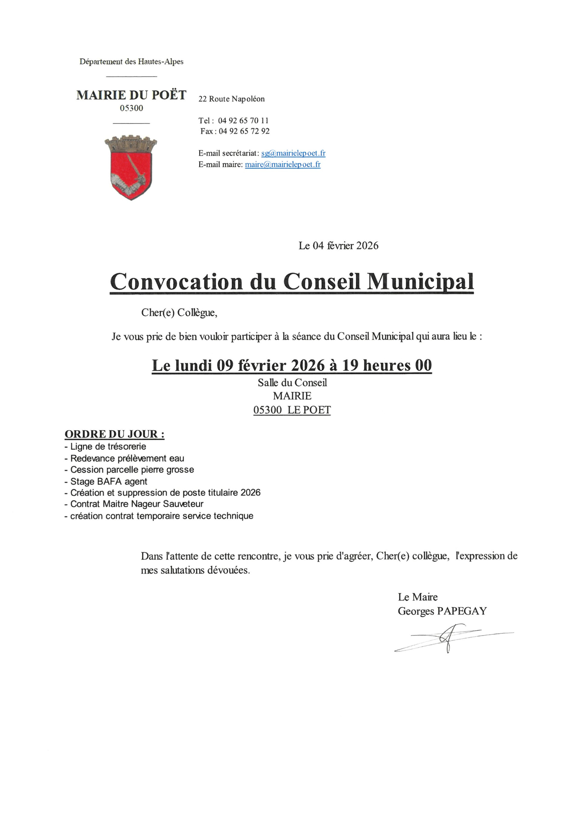 Le lundi 9 février 2026 à 19h00 dans la salle du Conseil