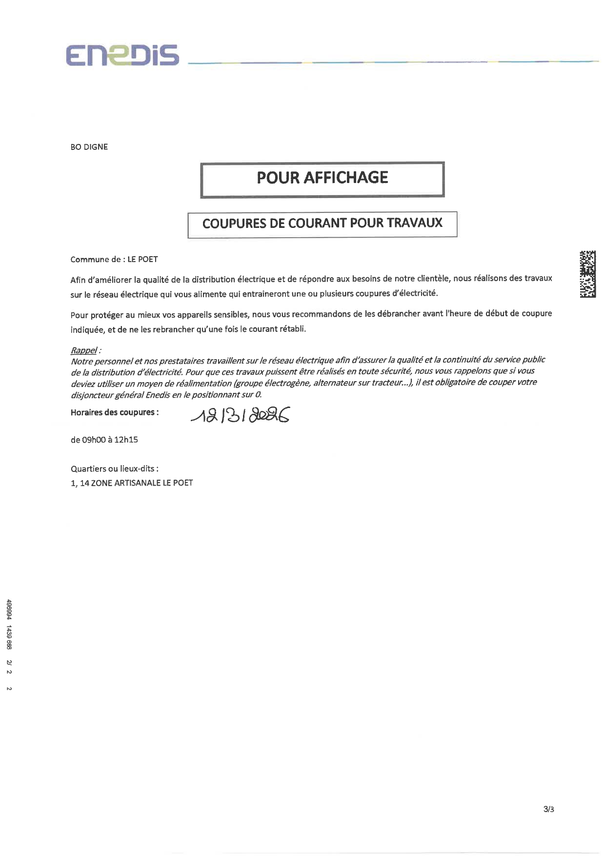 Coupure de courant pour travaux - Info Enedis - 12 mars 2026
