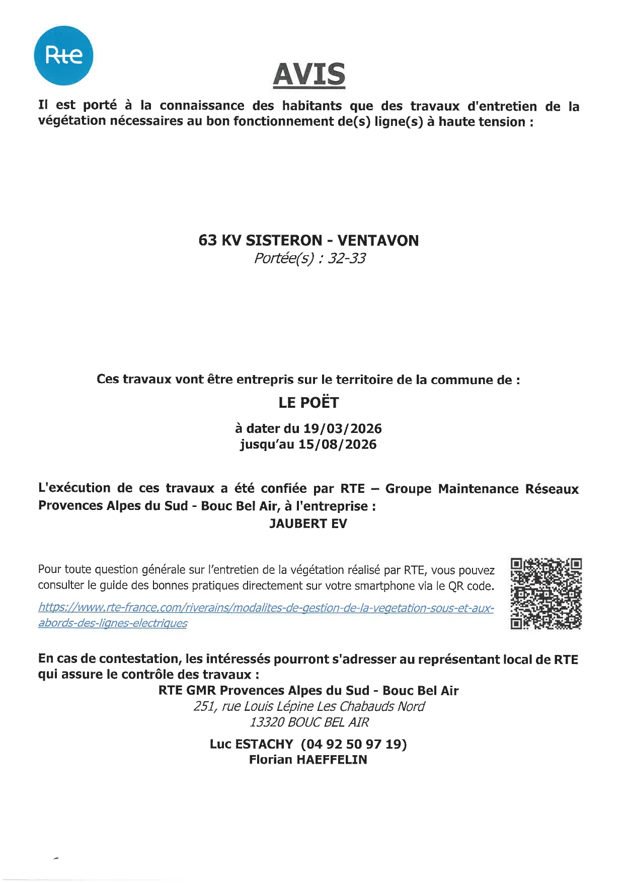 Travaux d'élagage et abattage nécessaires au bon fonctionnement des lignes à Haute Tension du 19/03/2026 au 15/08/2026