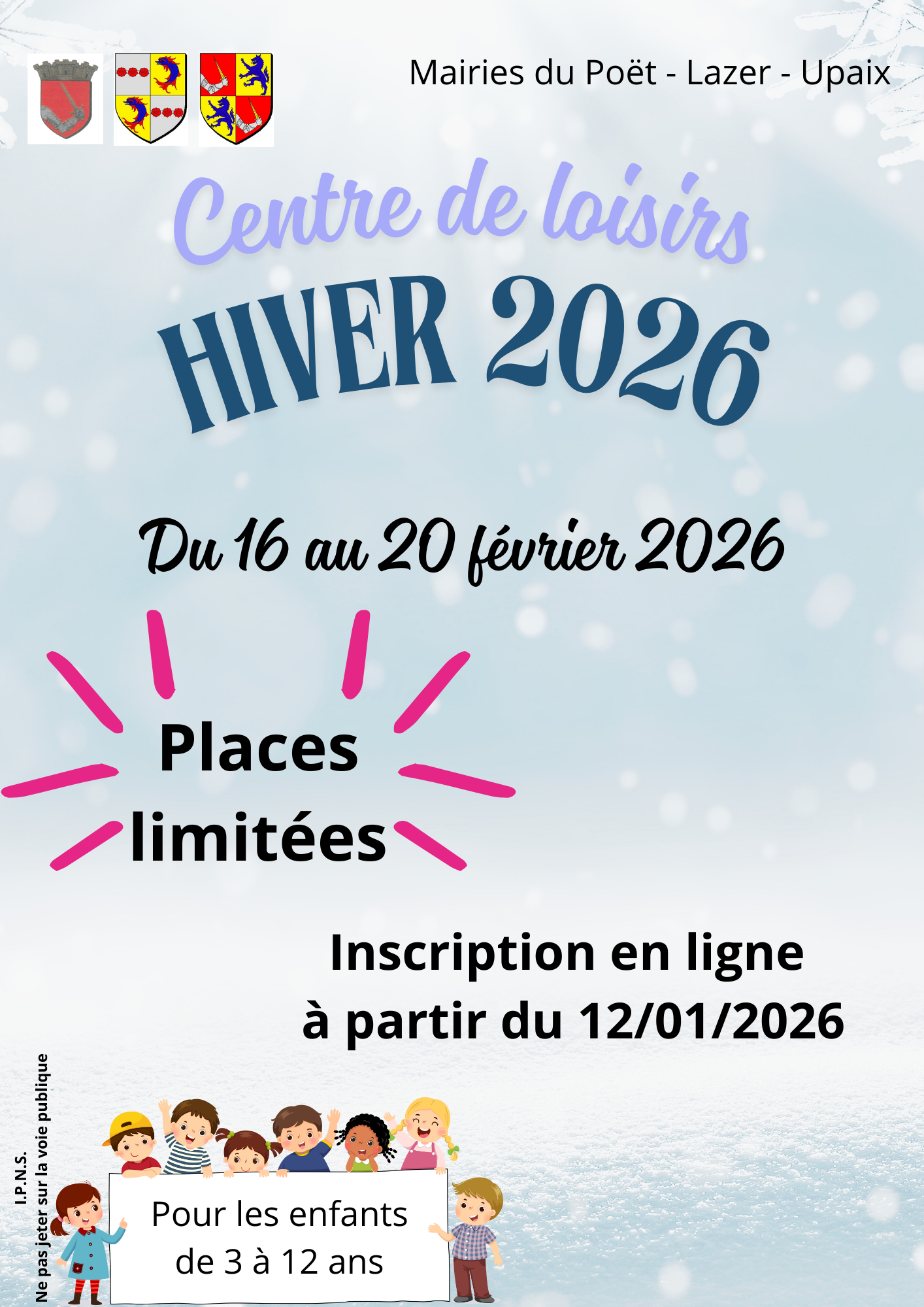 Inscriptions Il n’est plus nécessaire de porter un dossier papier. Notre agent de mairie saisira les informations sur un logiciel d’inscription. Les familles doivent se présenter en Mairie uniquement avec les pièces jointes suivantes : Pour les familles n’étant pas inscrites aux dernières vacances: