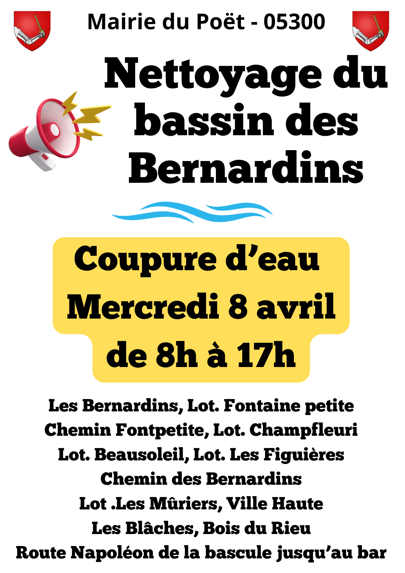 Coupure d'eau mercredi 8 avril : Nettoyage du bassin des Bernardins