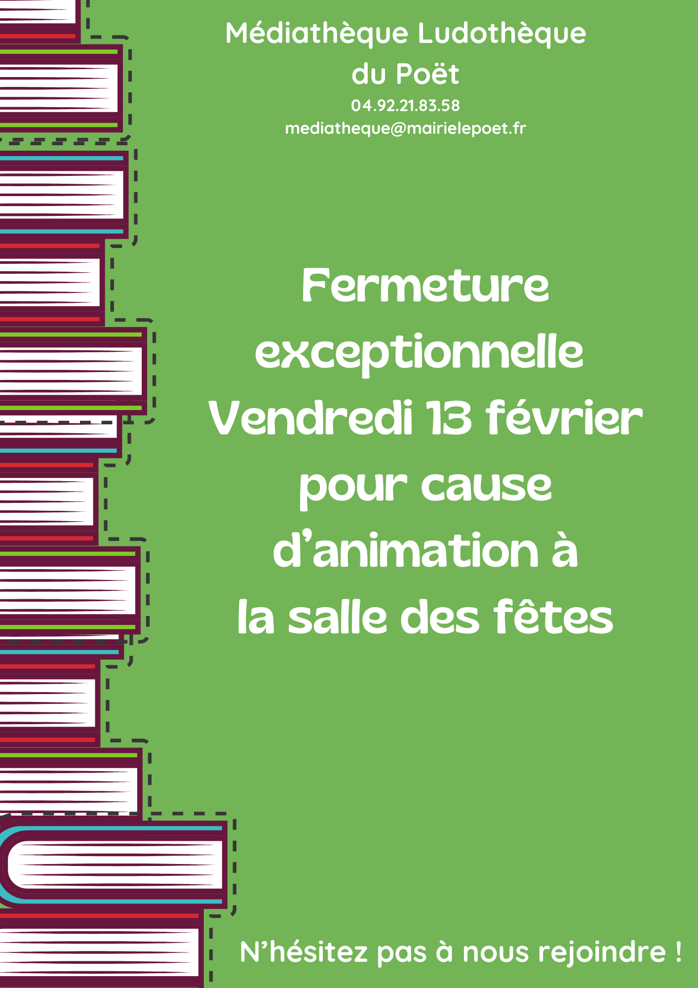 Vous pouvez nous contacter ATTENTION : Les collectivités (associations, écoles, etc.) ne peuvent bénéficier du service en dehors des animations proposées par la bibliothèque. N’hésitez à aller faire un tour de toutes les ressources proposées pour vous et vos enfants. Ce service est compris dans votre abonnement, il n’engendre aucun frais supplémentaire |